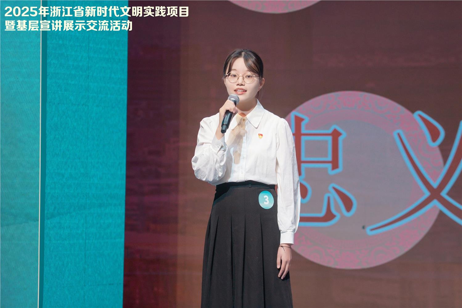 9月 26日,2025年浙江省新时代文明实践项目暨基层宣讲展示交流活动在台州温岭圆满落幕。来自义乌工商职业技术学院“望道行”理论宣讲名师工作室的“00 后”宣讲员:建筑工程学院学生丁梦霞,代表学校站上省级宣讲舞台,以《一“让”成义》为主题,深度结合义乌“六义”文化内核,用青春话语传递时代声音,赢得现场评委与观众的广泛好评。
