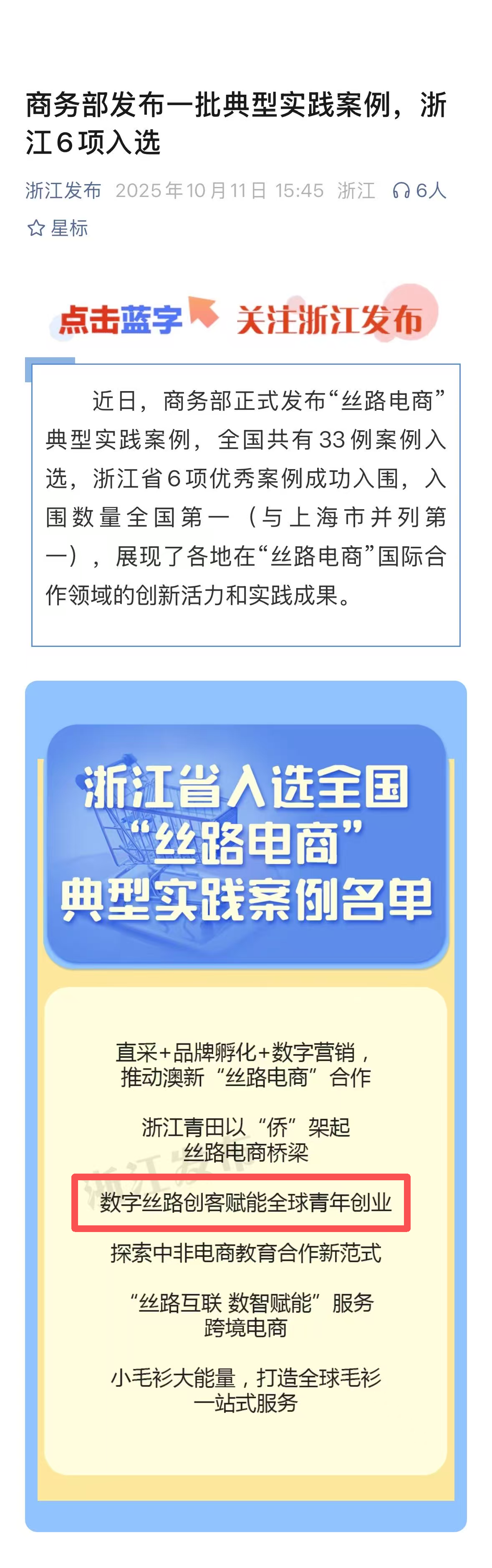 近日,商务部发布“丝路电商”典型实践案例,全国共有33例案例入选,浙江省共有6项优秀案例成功入围。我校国际教育学院与经济管理学院联合完成的《数字丝路创客赋能全球青年创业》案例成功入选典型实践案例,这也是浙江省入选案例中唯一来自高职院校的实践成果。