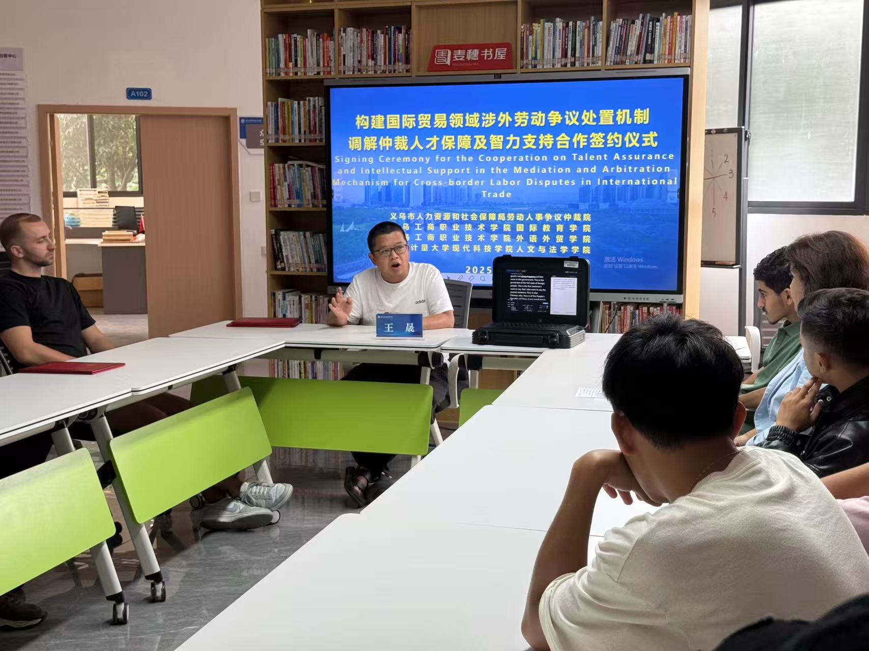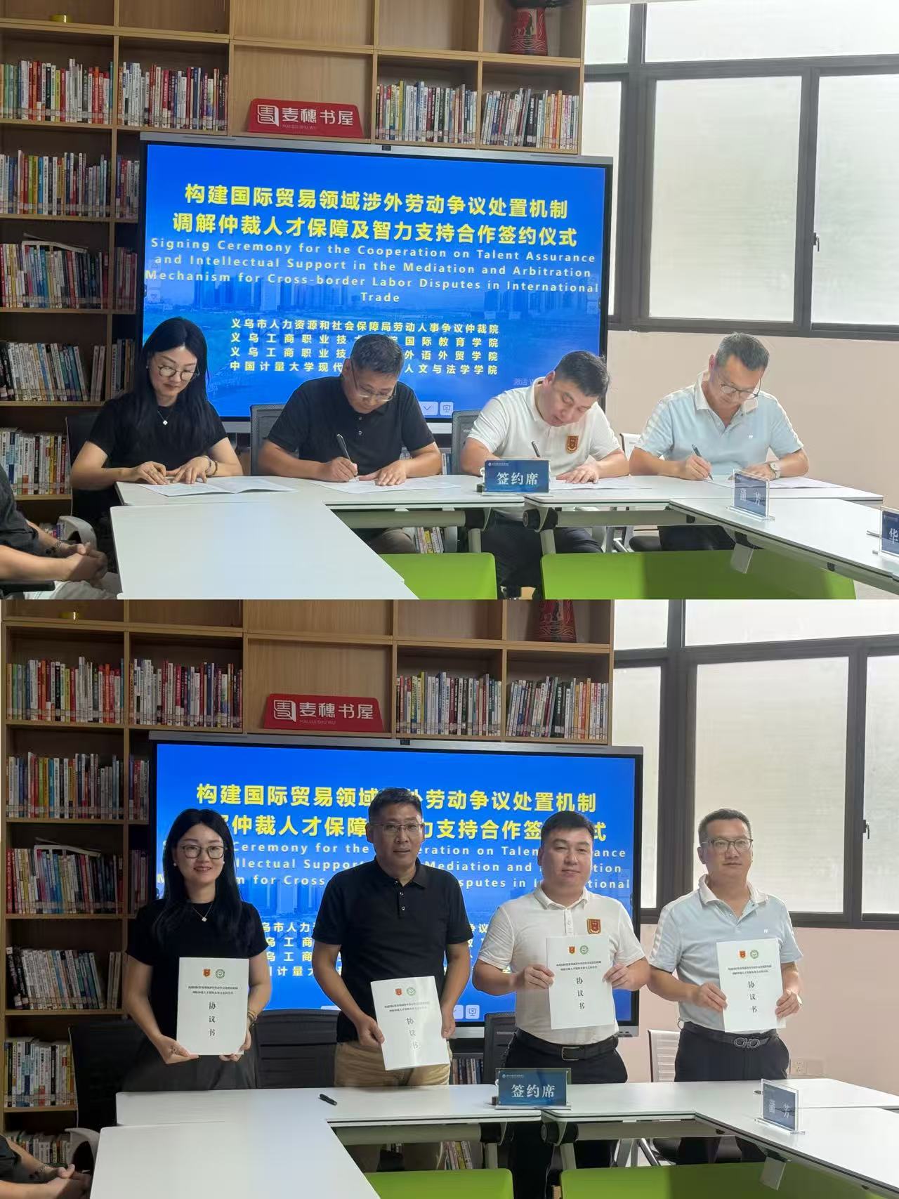 10月17日,“构建国际贸易领域涉外劳动争议处置机制,调解仲裁人才保障及智力支持合作协议”签约仪式在学校国际创客园举行。此次活动由我校国际教育学院承办,义乌市人社局劳动人事争议仲裁院院长刘晓坚、副院长王晟,中国计量大学现代科技学院人文与法学学院院长乔浩风、副院长蒲芳,我校外语外贸学院、国际教育学院党组织负责人和两校相关教师代表,以及十余名国际学生和创业校友代表参会。