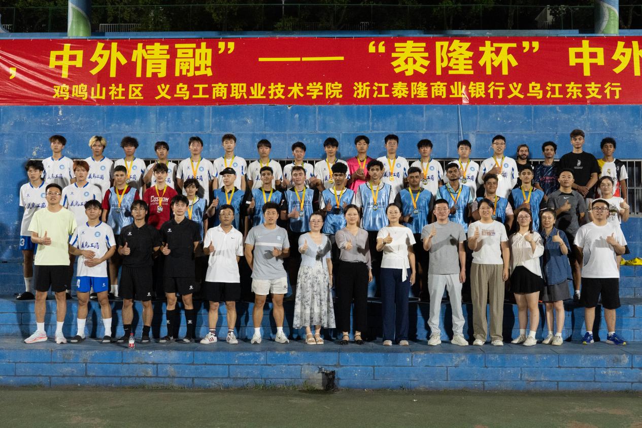 颁奖环节中,义乌工商职业技术学院马克思主义学院党委负责人、鸡鸣山社区党委书记王校校及浙江泰隆商业银行义乌江东支行行长朱益旭为两支队伍分别颁发定制奖牌与运动包,肯定全体球员的拼搏精神。