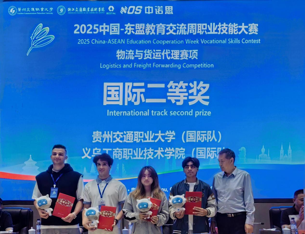 10月11日至13日,由中国-东盟教育交流周组委会秘书处、中国东盟交通职业教育联盟主办,贵州交通职业大学承办的2025中国-东盟教育交流周职业技能大赛物流与货运代理赛项成功举办。有来自中国及东盟、一带一路沿线、加拿大等国家和地区的共24支参赛队伍,分中国、国际两个赛道展开竞技。我校国际商务专业国际学生IBRAHIM ESKEF(李昊龙)和HASAN ASHRAF HASAN ABU-MOSAMEH(李健)小队斩获国际组二等奖,我校现代物流管理专业的朱静、邓慈小队斩获国内组优胜奖。