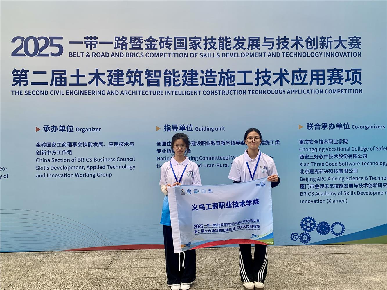 10月19日,由金砖国家工商理事会中方理事会、“一带一路”暨金砖国家技能发展国际联盟等单位主办的2025“一带一路”暨金砖国家技能发展与技术创新大赛(第二届土木建筑智能建造施工技术应用赛项),在重庆安全技术职业学院落下帷幕。本次比赛共有298支队伍参加,分为中职和高职本科国际两个赛道,其中高职共有134支队伍。参赛选手们经过激烈角逐,我校建工学院的朱伊一和詹祺欢团队获得了二等奖的好成绩,不负之前一起付出的共同努力。
