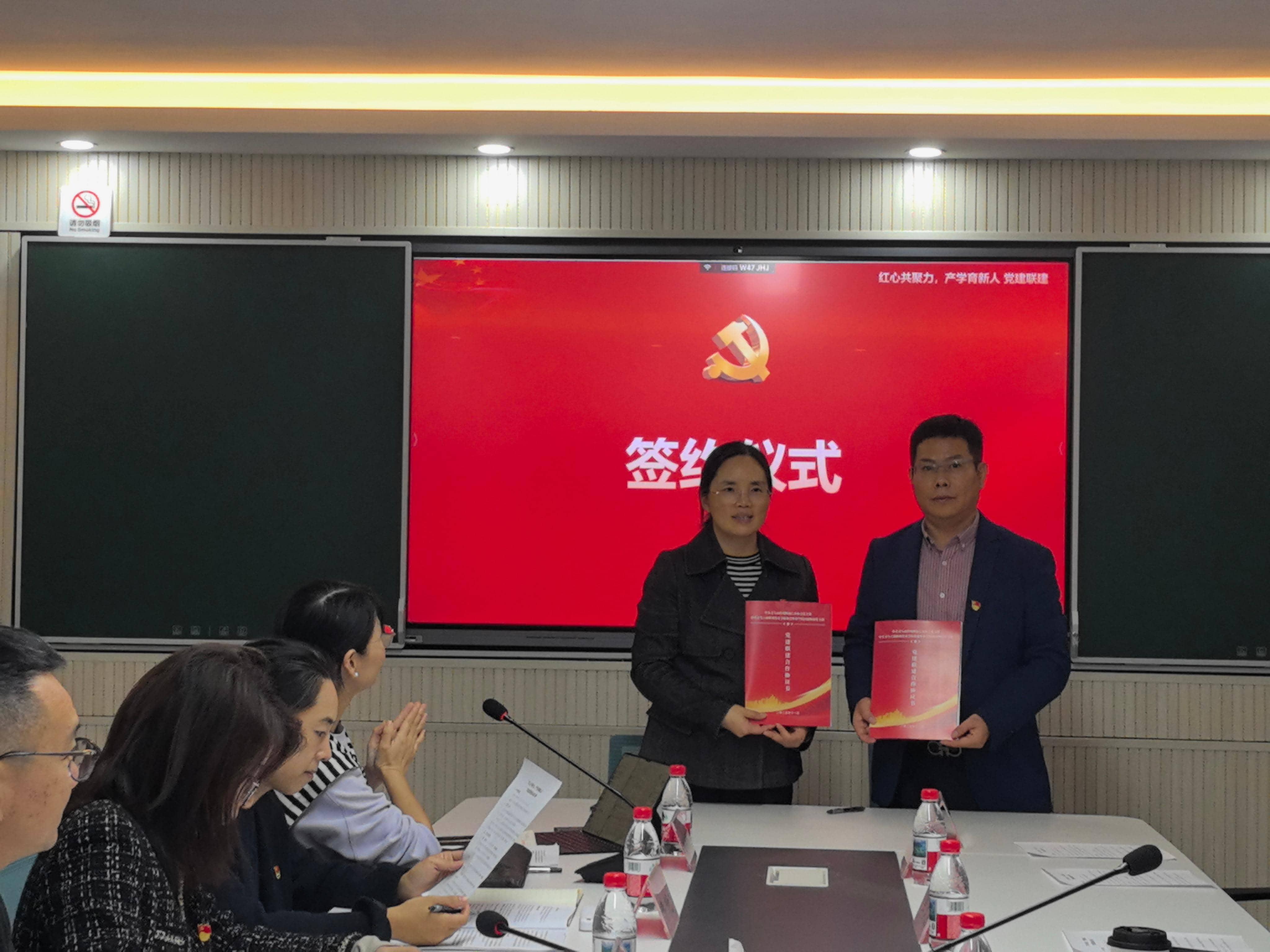 在随后的签约授牌环节,外语外贸学院党委书记华承健为义乌市跨境物流行业协会授予“校企党建联建基地”牌匾。外语外贸学院国商物流党支部书记王耀燕与义乌市跨境物流行业协会党支部书记金旭峰共同签署党建联建合作协议。这不仅标志着双方在物流人才培养、行业服务等领域的合作正式迈入规范化、长效化新阶段,更明确了未来将围绕跨境物流专业课程优化、企业导师进校园、学生实习实训基地建设等核心方向深化合作,搭建资源共享、优势互补的物流产业服务与人才培育优质平台。