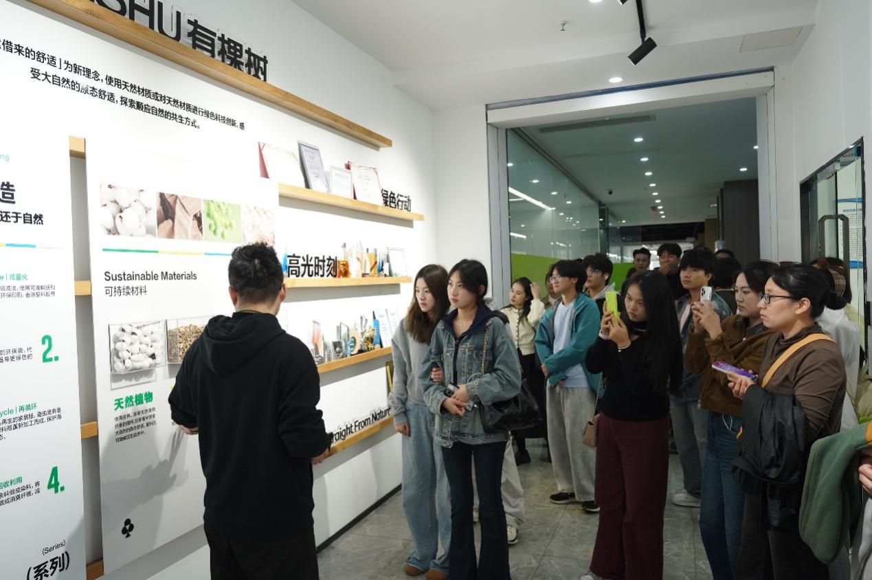 随后,师生校友代表奔赴校友企业国内知名贴身衣物品牌 “有棵树” 开展沉浸式创新创业实践活动。作为内衣服饰行业新消费领域的快速成长型企业,“有棵树” 自 2018 年成立以来,始终秉持 “从大自然借来的舒适” 的品牌理念,专注为消费者提供环保舒适的生活方式类产品。数据显示,2024 年该品牌营收达 20 亿元,同比增长 15%,用户总量突破 6000 万人,市场影响力持续攀升。在企业工作人员的引导下,师生一行实地探访了产品研发中心及品牌展示区,全面了解企业运营全链条,详细观摩了 “天然植物、再生植物、植物科技、生物蛋白” 四大系列核心产品,直观感受环保设计与商业创新的深度融合。