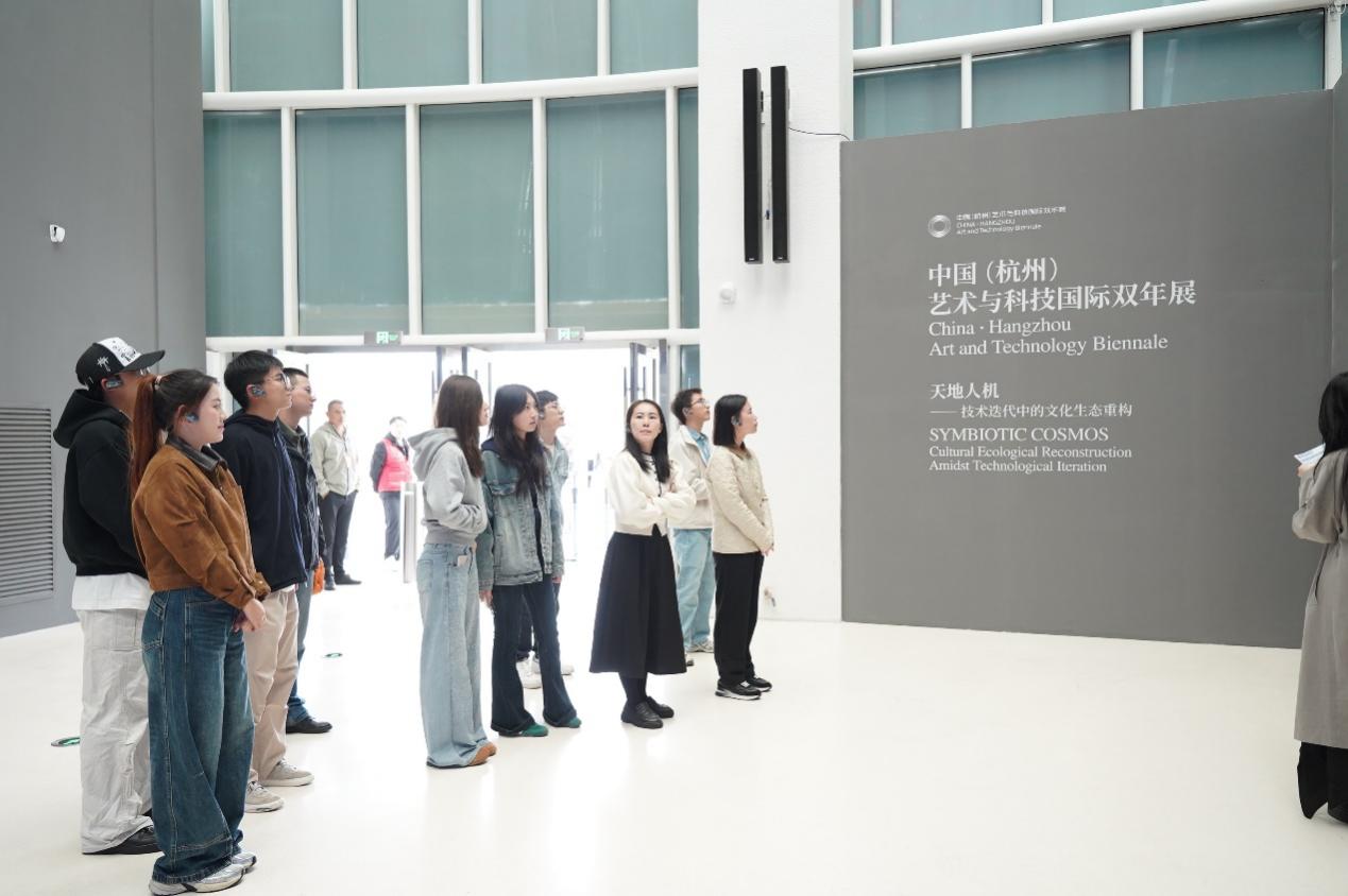 在余杭美术馆,师生校友一行沉浸式体验 “艺术与科技双年展” 的独特魅力。展览打破传统静态陈列模式,以光影艺术构建沉浸式视觉幻境,通过互动装置实现观众与作品的深度互动。其中,“自然共生” 主题装置运用 3D 植物建模与生态数据可视化技术,生动诠释了科技与自然的和谐共生关系,引发师生校友的广泛热议。数十位跨界创作者打造的特色展区内,水墨艺术与数字技术交融、人工智能与手工创作对话,展现出创意产业的多元发展态势。参与活动的校友结合自身数字设计等从业经历,与师生深入交流跨界作品的创作思路与技术难点,让大家深刻认识到艺术与科技融合的创新潜力,进一步拓宽了专业视野。