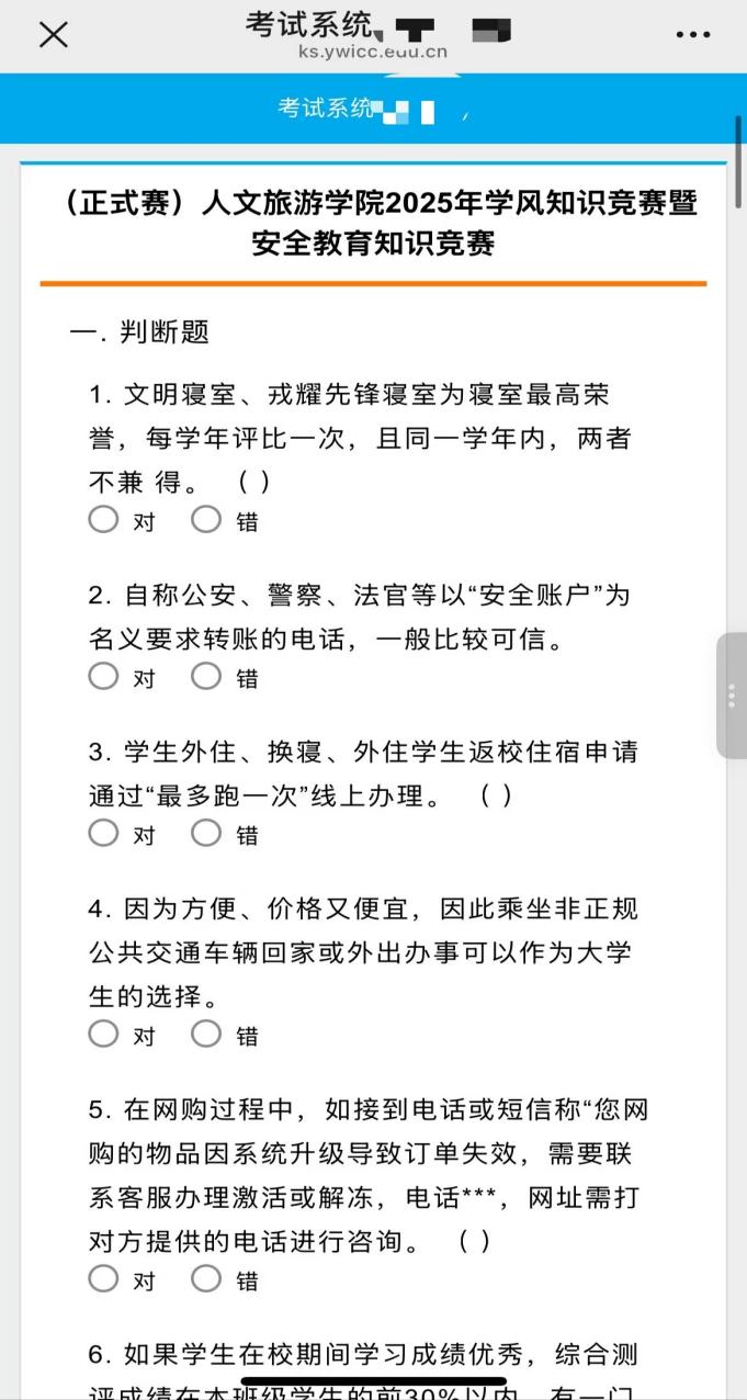 为巩固学风建设成果、强化校园安全意识,工作室于12月8日至12日开展“学风知识竞赛暨安全教育知识竞赛”。竞赛采用线上答题形式,内容涵盖学风制度、学习方法、校园安全及应急处理等多方面知识。活动设置练习赛与正式赛两个阶段,鼓励同学们以赛促学、以学促行。最终评选出一、二、三等奖及优秀奖若干,并颁发相应奖品。此次竞赛不仅检验了学生的学习成果,更将安全教育融入日常,提升了学生的自我保护与应急处理能力。