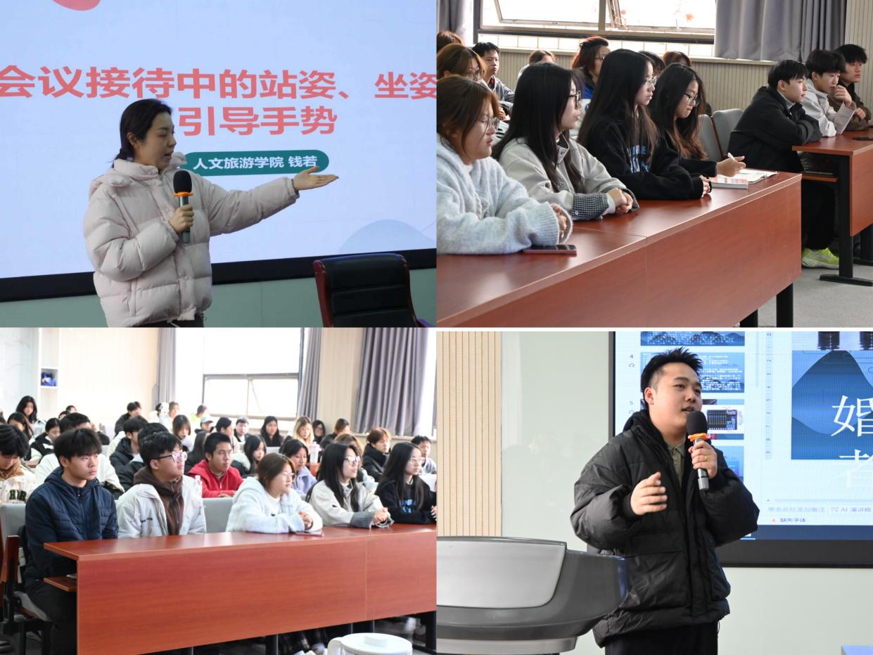 12月5日中午,学生干部礼仪素养培训讲座于望道楼419开讲。本次讲座特邀钱若、郑州两位老师主讲,围绕日常交往礼仪、会议接待规范、学生干部形象管理等内容展开,系统提升学生骨干的沟通能力与职业素养。讲座面向全院学生干部积极参与,体现了学院以点带面、辐射全院的育人思路。同学们表示,将把所学礼仪知识融入工作与生活,以更专业的姿态服务师生、展现风采。