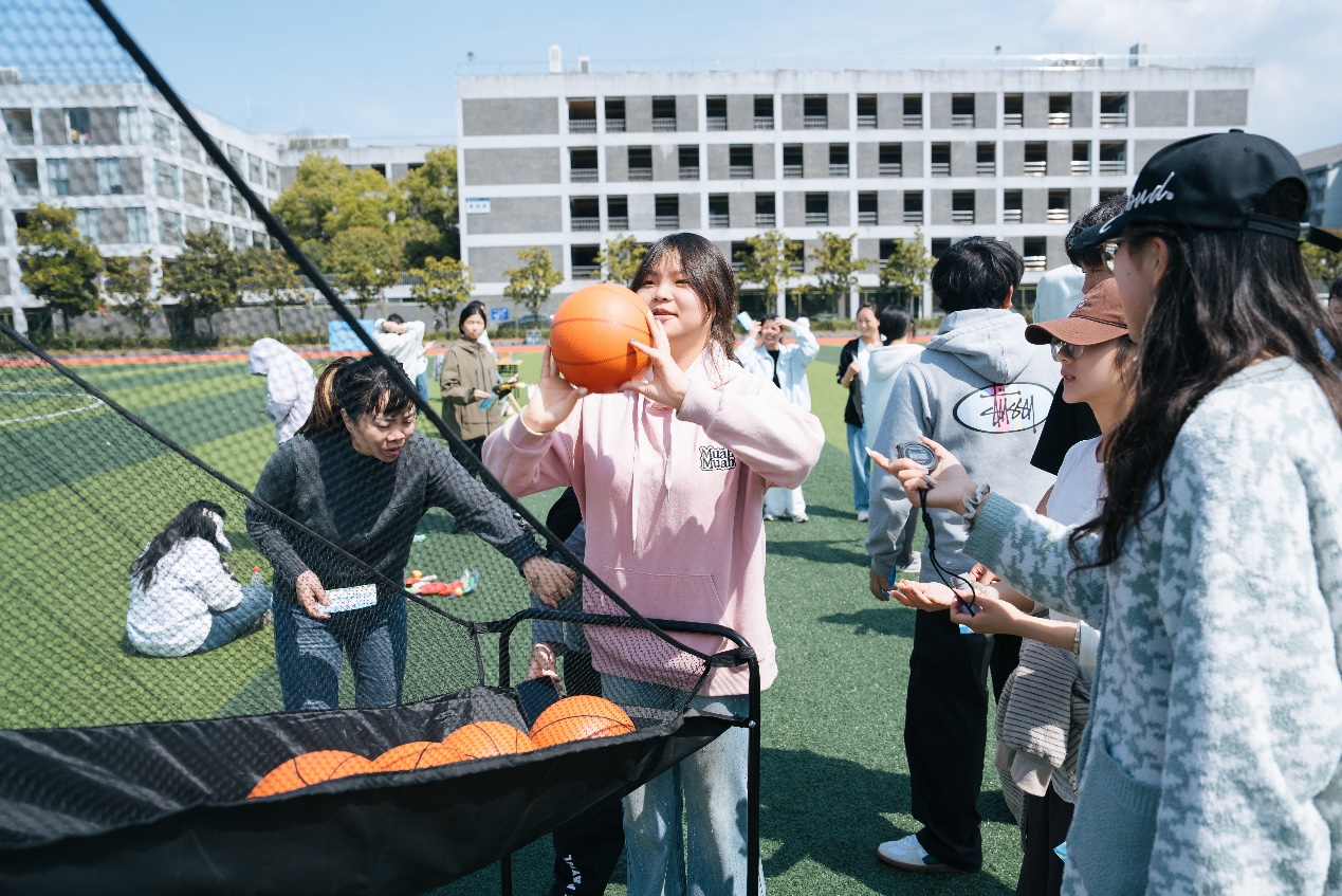 本次趣味运动会精心设置挑战竞技区、解压释放区、趣味互动区、文艺展演区四大区域,安排了指压板跳绳、翻滚保龄球、飞盘九宫格等12个趣味体验项目,竞技区里,踢毽子、投篮机等项目让学生们在专注闯关的过程中收获成就感,解压区的保龄球、愤怒的小鸟等项目,大家尽情投掷、射击,尽情释放学习生活中的压力与情绪,活动吸引近300名学生参加,活动现场气氛热烈,欢声阵阵。