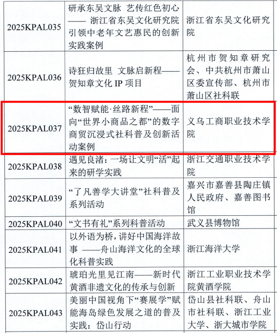 近日,浙江省社会科学界联合会公布了2025年度浙江省“社科普及创新活动案例、红色基地精品活动案例”名单,我校“数字商贸”社科之家申报的“数智赋能?丝路新程”数字商贸沉浸式社科普及创新活动案例成功入选,标志着学校在推动科普工作、促进科教资源科普化方面取得了新的突破。