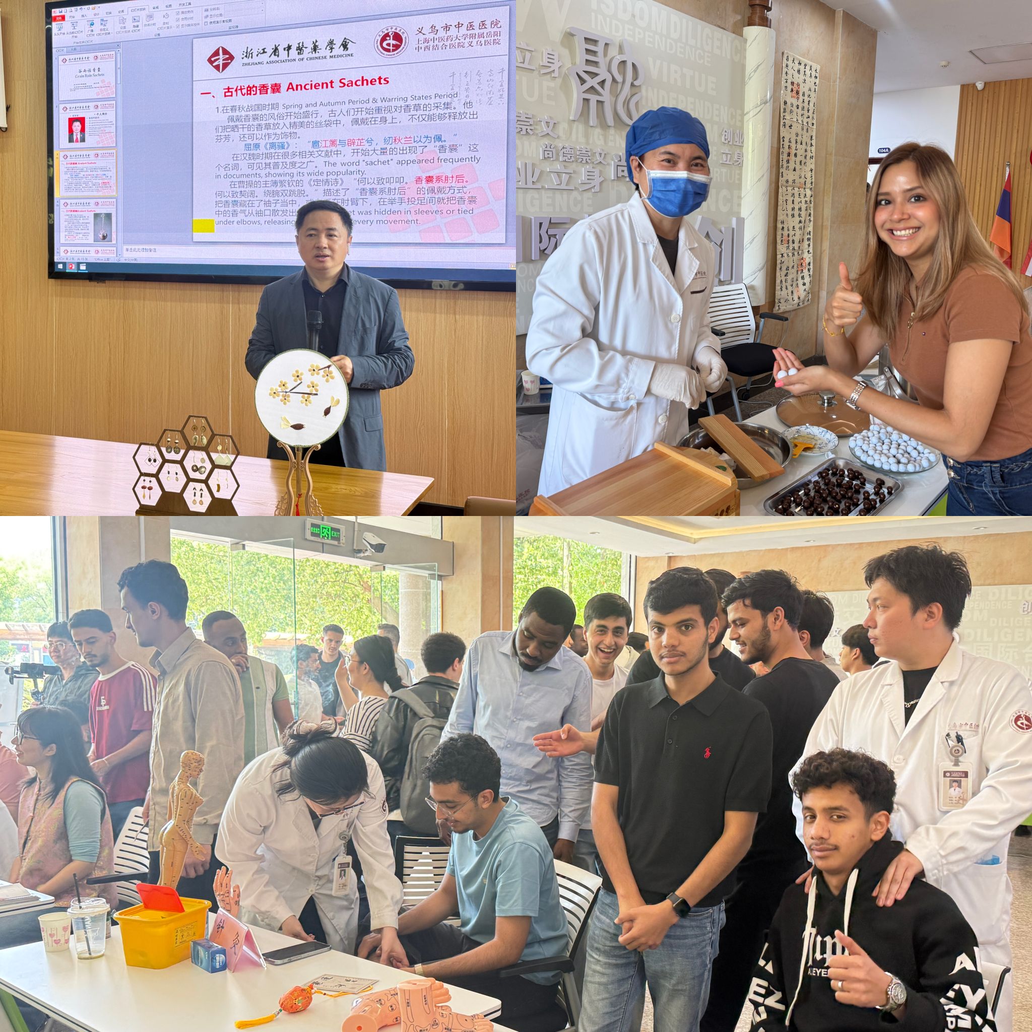 启动日当天,学院还特别邀请义乌市中医医院(义乌朱丹溪文化研究办)专家,现场讲解中医基础理论与养生知识、辨识常见药材,并在现场对针灸、推拿、拔罐、艾灸等中医适宜技术逐一实操,将国家级非物质文化遗产朱丹溪中医药文化全方位呈现给国际学子。国际学生们亲手制作中药香囊、品鉴养生茶饮、品尝古法大山楂丸,直观理解中医“治未病”的康养理念,沉浸式感悟“药食同源、香药同功”的传统中医智慧。中医药文化体验作为本次活动的重点环节,深受国际学生欢迎。通过校地联动,搭建朱丹溪中医药文化对外展示的窗口,让国际学子近距离读懂朱丹溪中医药文化底蕴,持续深化中外文明交流互鉴。