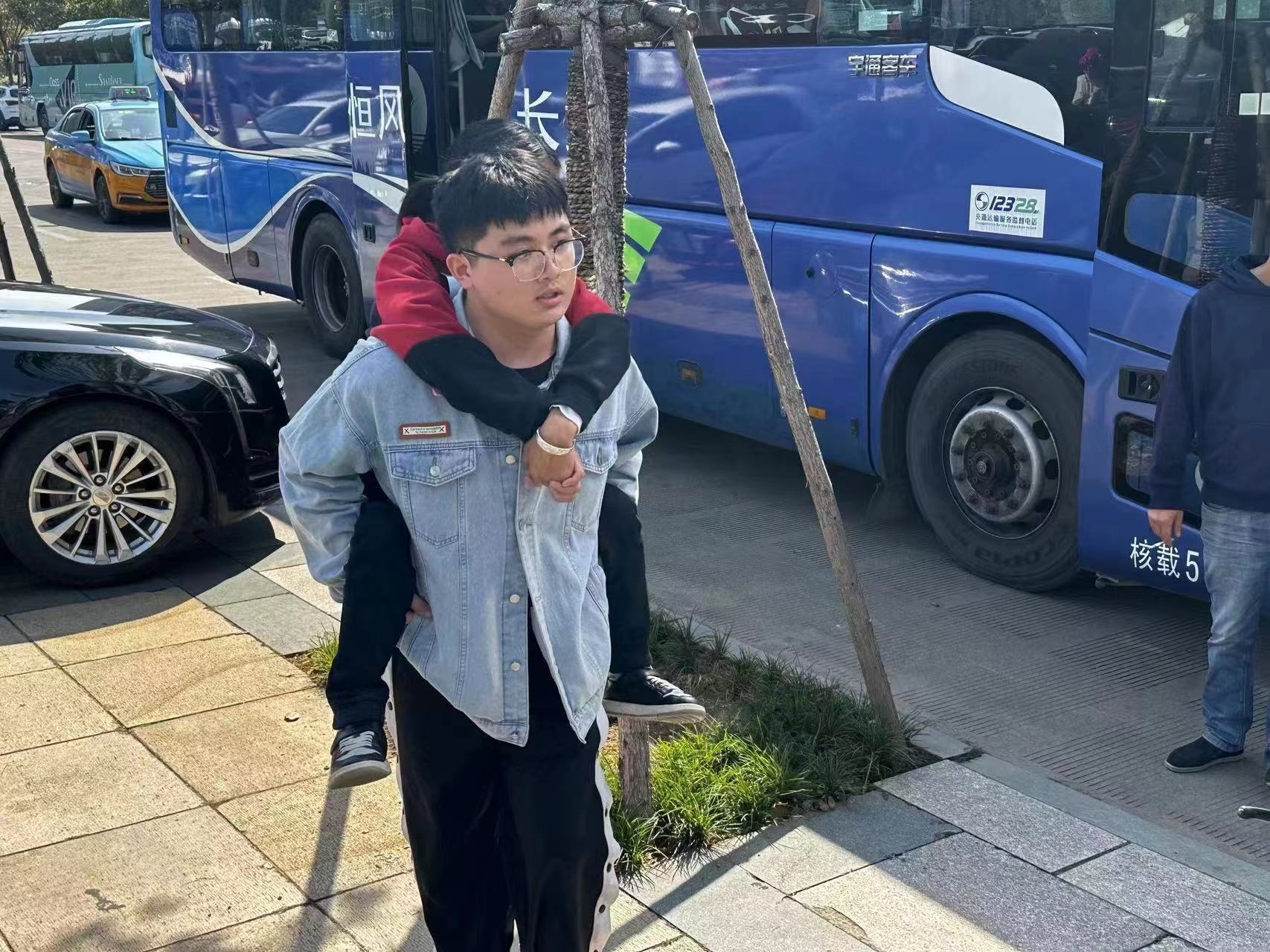 “嬢嬢腿脚天生缺陷,无法正常走路。22日那天我们去看比赛场地,由于大巴车只能等在义乌国际博览中心外面,有很长一段距离要走,我就背起了她。”詹睿告诉记者,听说自己背嬢嬢的照片被发到好几个群,他还有点不好意思,“背嬢嬢其实是很自然的事”。