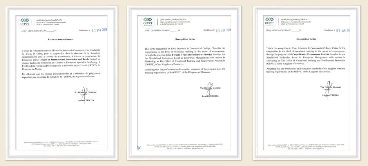 近日,义乌工商职业技术学院国际经济与贸易专业标准及“外贸跟单实务”“跨境电商实务”两门课程标准获得摩洛哥职业教育与就业发展办公室(OFPPT)官方认证,意味着该校首个专业标准及课程标准成功输出海外。