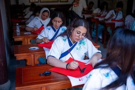 “有礼仪之大故称夏,有服章之美谓之华”,他们身着汉服,亲身感受中华服饰文化的优雅飘逸之美,跟着国学老师学习作揖、行礼,感受中华传统礼仪的端方沉稳之美,学写毛笔汉字,感受汉字和书法墨韵之美,在老师指导下写下“双龙”、“仙的金华山”等字样,他们表示自己第一次体验中国书法,作品一定要珍藏起来,带回国作纪念。
