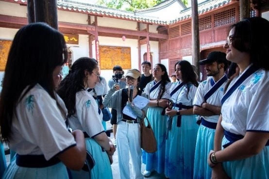 7月18日,金华双龙风景旅游区鹿田书院迎来了一群身穿汉服的“洋面孔”,吸引了现场游客驻足观望,并用半生不熟的英文夸奖点赞,他们是来自义乌工商职业技术学院摩洛哥义乌商学院的青年学子们,与游客热情互动的同时,留学生们认真听取导游翻译讲解,兴奋地感受这座千年书院的悠久历史和灿烂的儒家文化。