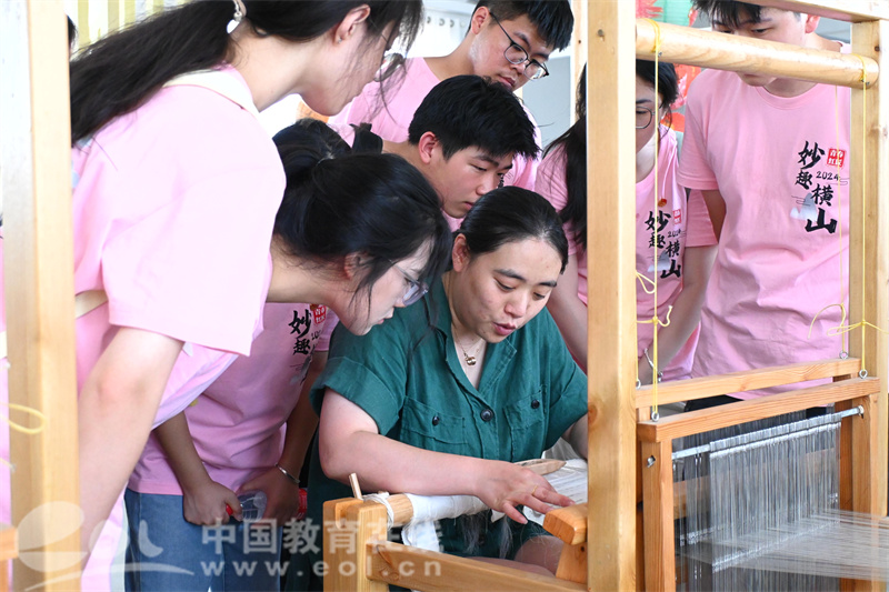 在湖州吴兴双林绫绢厂,同学们踏入了绫绢的世界,在车间里近距离观看了绫绢的制作过程,感受到了车间劳作的辛苦,感叹每样作品的背后都有太多心血和汗水的凝结,并聆听双林绫绢的国家级非遗传承人郑依霏大师分享双林绫绢的每一个织造细节和背后的故事。