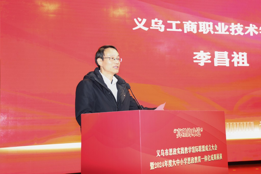 李昌祖在致辞中对出席活动的各位领导、嘉宾表示热烈的欢迎。他回顾了近年来义乌工商职业技术学院在思政教育一体化建设方面所取得的成就,并表示学校作为义乌市大中小学思政课一体化联盟理事长单位,深感责任重大、使命光荣。他指出,义乌市思政实践教学馆际联盟的成立,标志着义乌市在思政教育一体化建设征程上又迈出了坚实的一步。学校将进一步汇聚各方力量,共同探索思政实践教学的新路径、新方法,努力培养更多具有爱国情怀、创新精神和实践能力的优秀人才。