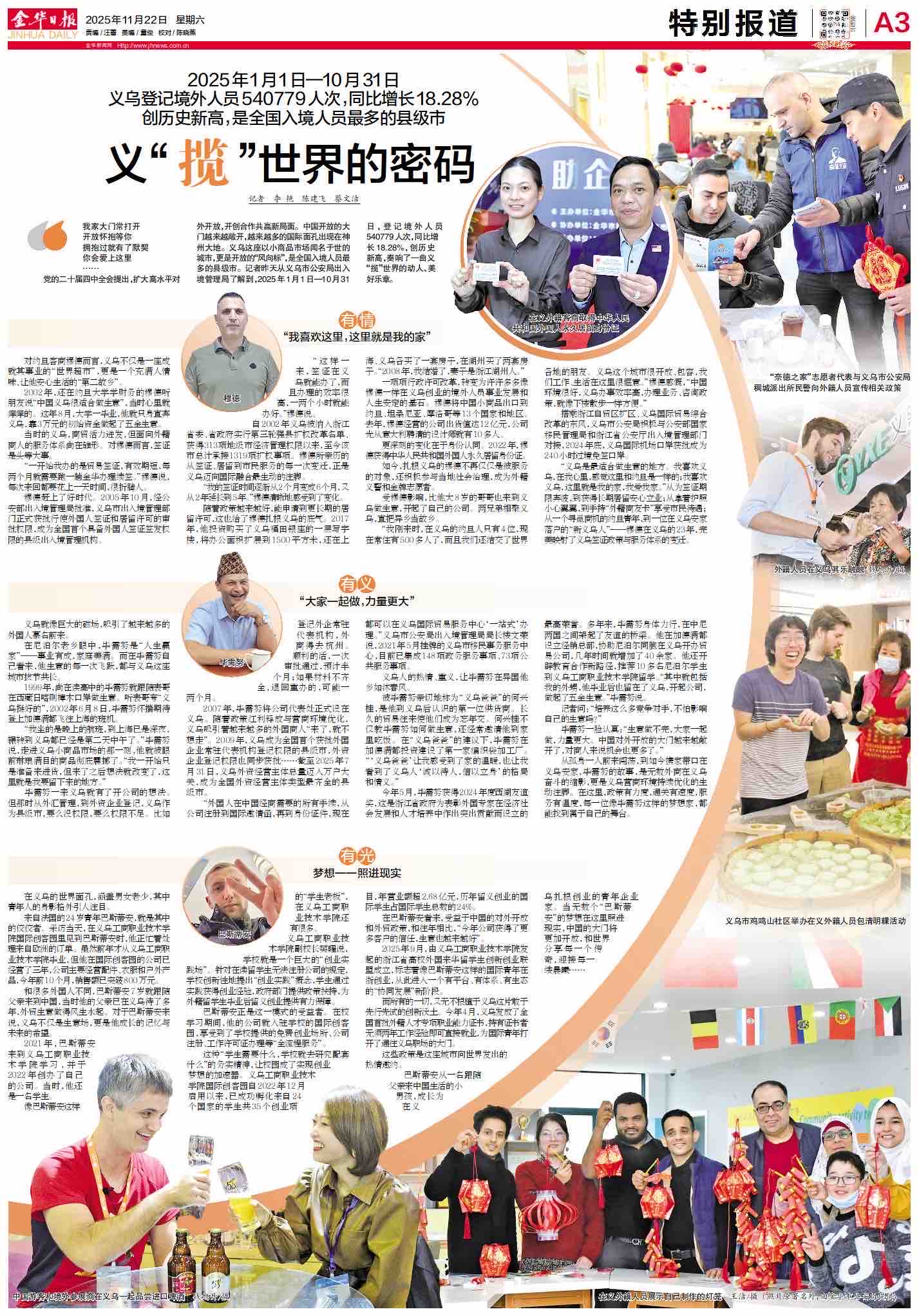 党的二十届四中全会提出,扩大高水平对外开放,开创合作共赢新局面。中国开放的大门越来越敞开,越来越多的国际面孔出现在神州大地。义乌这座以小商品市场闻名于世的城市,更是开放的“风向标”,是全国入境人员最多的县级市。记者昨天从义乌市公安局出入境管理局了解到,2025年1月1日—10月31日 ,登记境外人员540779人次,同比增长18.28%,创历史新高,奏响了一曲义“揽”世界的动人、美好乐章。