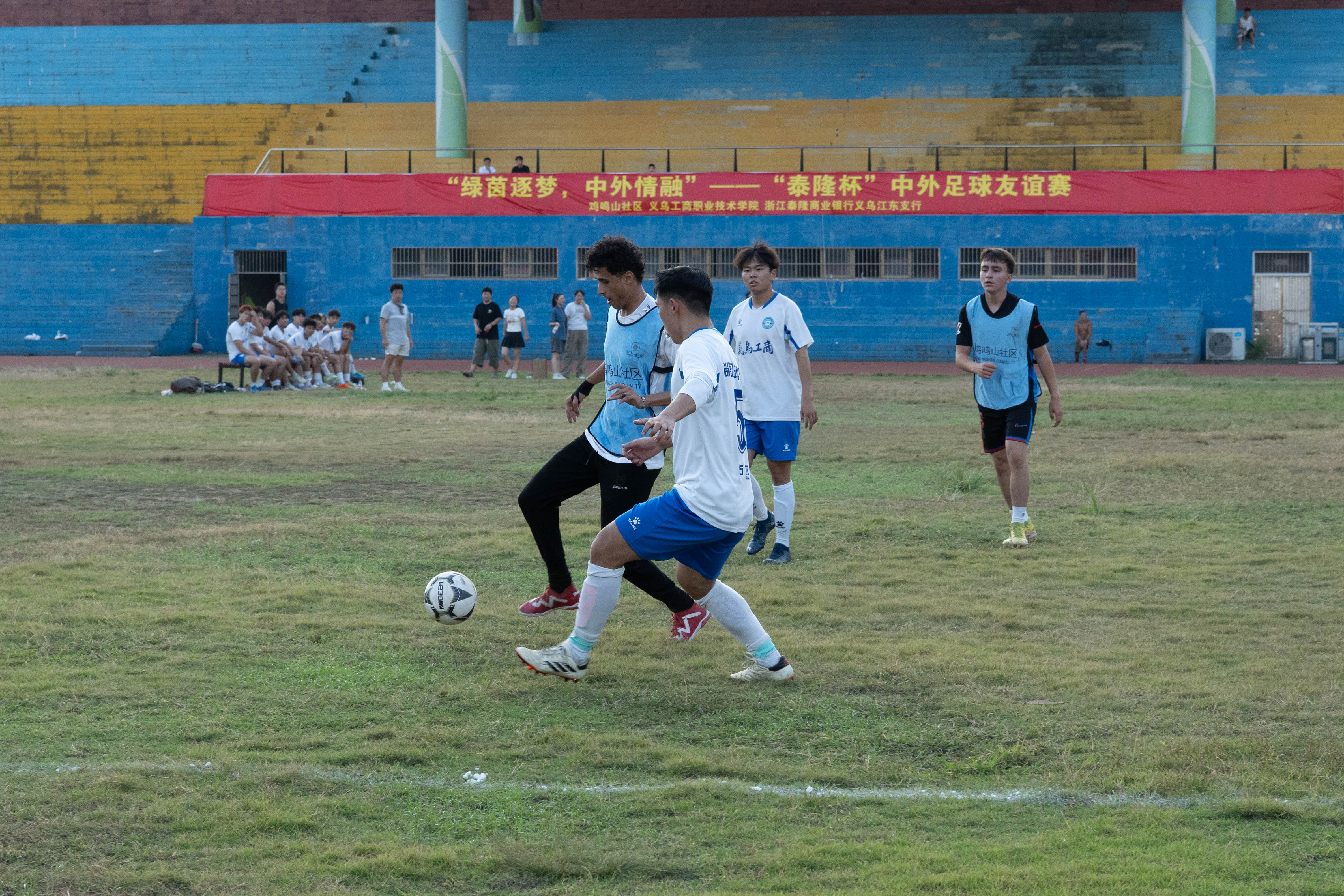 10 月 12 日下午,义乌工商职业技术学院依山足球场上,呐喊与欢呼交织成跨语言的热情乐章。一场由鸡鸣山社区牵头,联合义乌工商职业技术学院、浙江泰隆商业银行义乌江东支行、同悦社工共同打造的“泰隆杯”中外足球友谊赛热血开赛。来自也门、叙利亚、埃及等共建“一带一路”国家的在义青年足球爱好者,与义乌工商职业技术学院尚德足球俱乐部男子足球队同场竞技,以足球为信使搭建文化交融之桥,用奔跑与协作诠释“一带一路”倡议中“民心相通”的青春内涵。